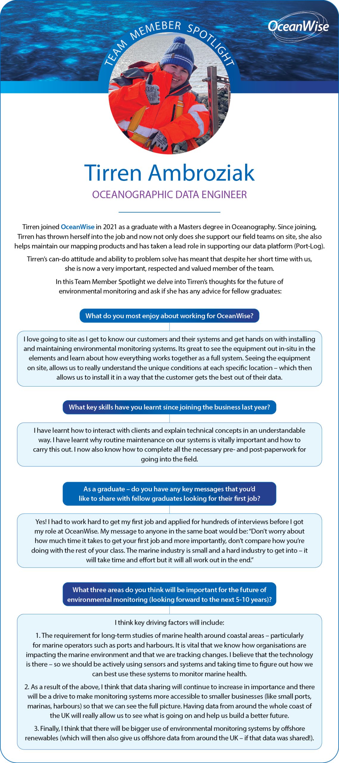 OceanWise gives you a wide array of opportunities to progress and hone your skillset, and the ability to work on a variety of different projects and with different clients, using marine science/engineering in interesting and innovative ways. The team is small (though expanding) and really friendly, and new ideas/ways of doing things are appreciated and listened to.