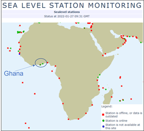For these countries the presence of reliable tide gauge stations should be a very high priority however as the image below shows, sometimes this seems not to be the case. The map below, which shows sea level monitoring stations across Africa and parts of Asia as at 27th of January 2022, pinpoints all stations across the area and categorises them by status. Those that are either offline or the data that they produce is out of date are shown as red dots, stations not available are blue dots and stations which are online and producing ‘good’ data are green dots.