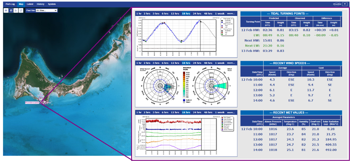 Port-Log is used by a range of customers across the globe and is a quick and easy management and publishing platform for environmental data. Being a cloud-based data platform, it enables data to be stored securely and published in near real-time via the web, as well as maintaining long-term historical records. Within Port-Log the user can view geographic distribution as well as tabular data feeds from each site as seen here on the right. The ‘Latest’ page shows a list of the most recently received data from all sites and sensors on the network and, where available. incorporates tidal predictions to calculate surge or cut values.