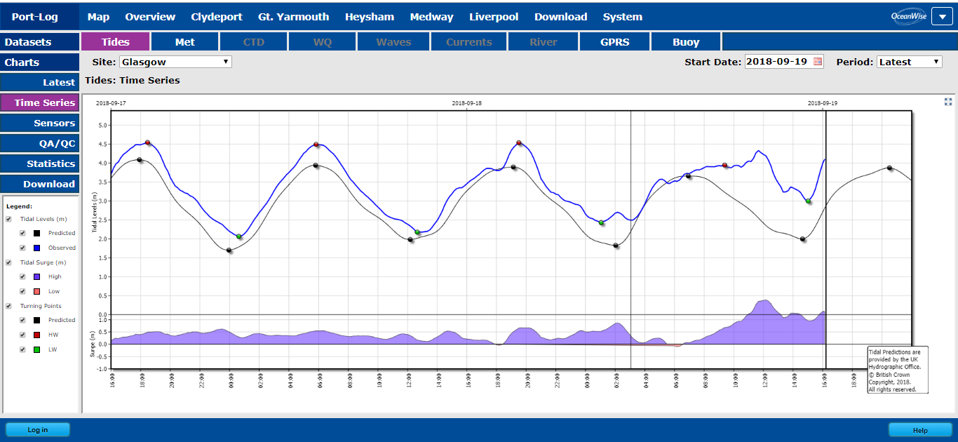 The above image, which has been extracted from Port-Log demonstrates tide surges, tide predictions and real-time tide (“observations”).