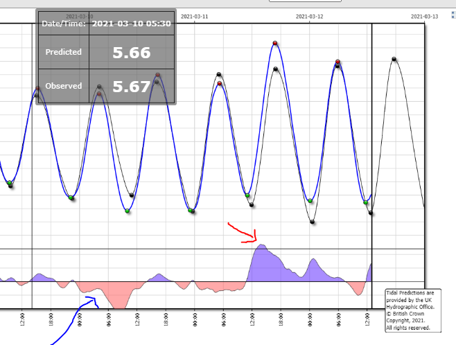 above image: snippet from OceanWise data platform Port-log showing a tidal cut (indicated by the blue arrow) and a few days later a tidal surge (indicated by the red arrow) on the East coast of UK during w/c 8th March 2021