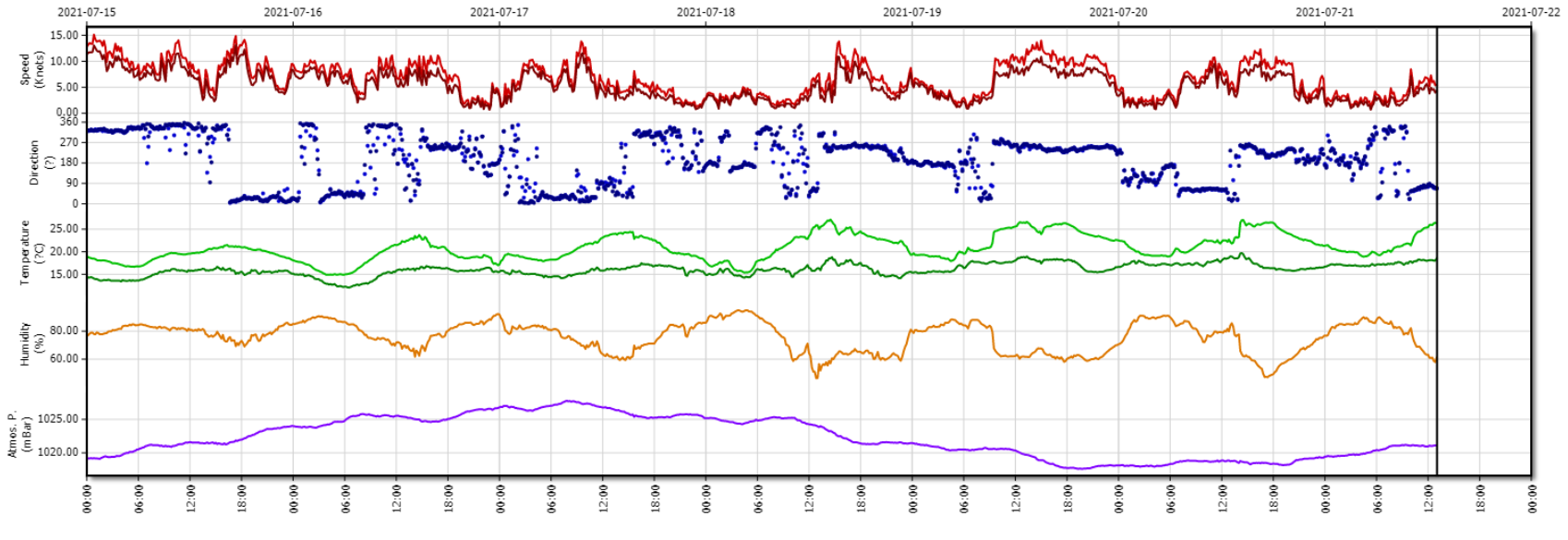 above image shows a screen shot taken from our Port-Log system from a met sensor on the South Coast from w/c 15th July 2021 showing temperature, humidity and wind